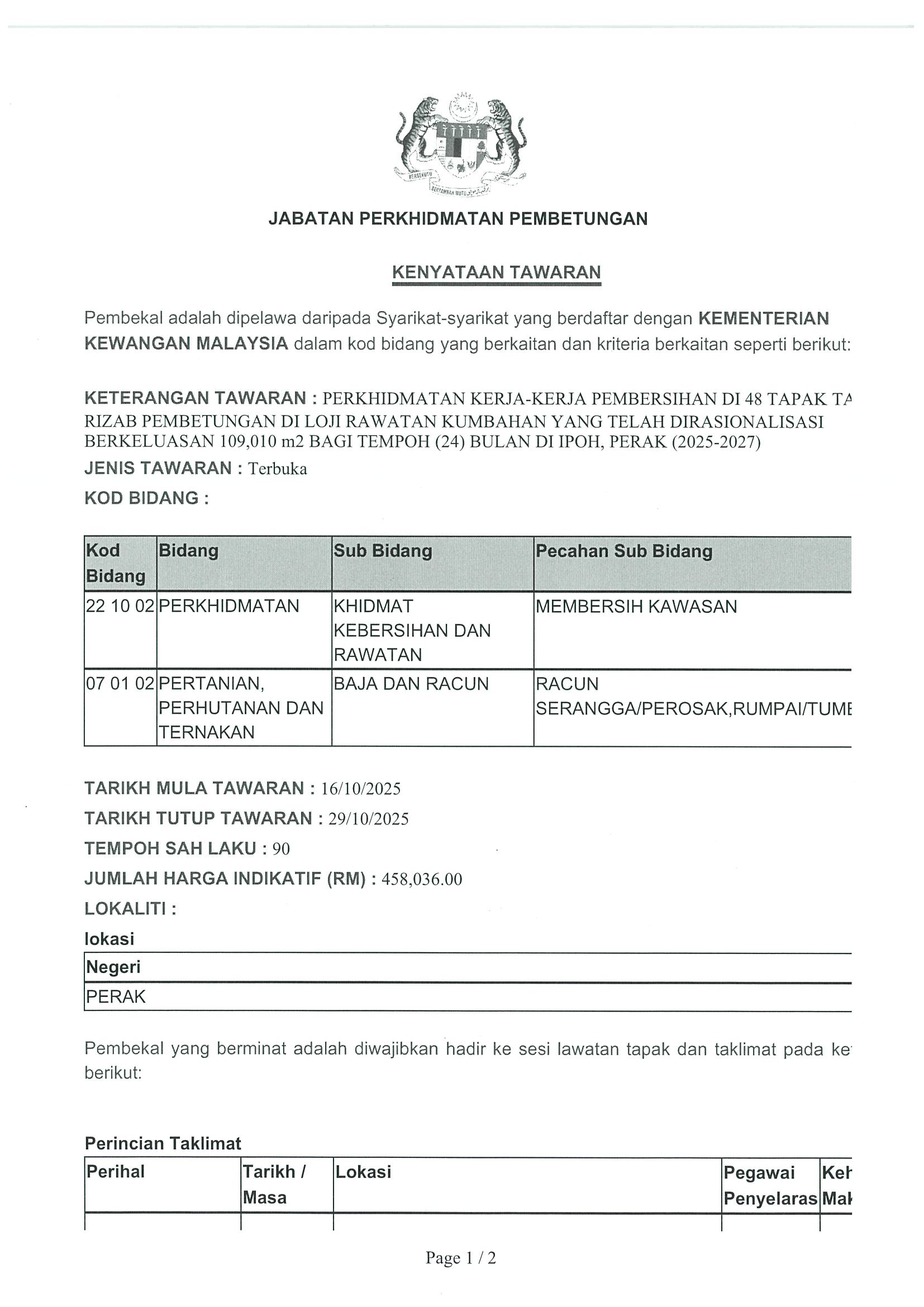 KENYATAAN TAWARAN : PERKHIDMATAN KERJA-KERJA PEMBERSIHAN DI 48 TAPAK RIZAB PEMBETUNGAN DI LOJI RAWATAN KUMBAHAN YANG TELAH DIRASIONALISASI BERKELUASAN 109,010m2 BAGI TEMPOH (24) BULAN DI IPOH, PERAK ( 2025-2027 )