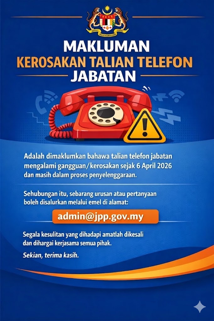 Adalah dimaklumkan bahawa talian telefon jabatan mengalami gangguan/kerosakan sejak 6 April 2026 dan masih dalam proses penyelenggaraan.