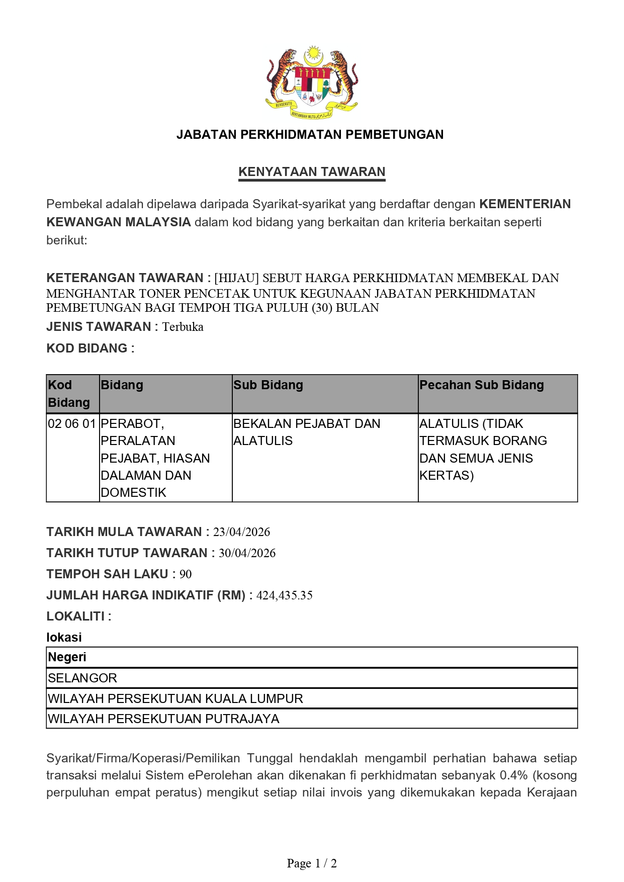 Tarikh Tutup Tawaran : 30/4/2026