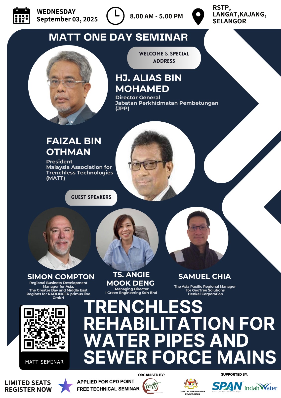 3 September 2025 (Rabu) - Timbalan Ketua Pengarah, Jabatan Perkhidmatan Pembetungan (JPP) merasmikan seminar bertajuk : MATT One Day Seminar - Trenchless for Rehablitation for Water Pipes and Sewer Force Mains yang dianjurkan oleh Malaysia Association for Trenchless Technologies (MATT) di Loji Rawatan Kumbahan Berpusat Langat dengan kehadiran wakil JPP, MATT, IWK dan SPAN